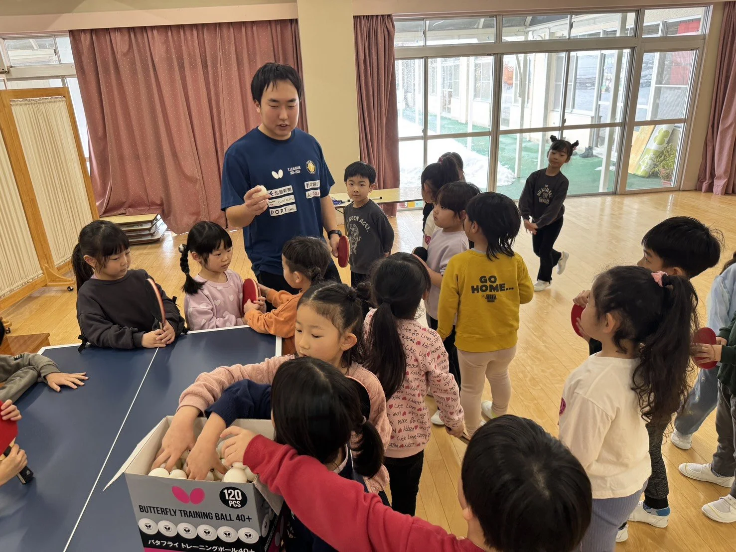ラリー体験やボール入れ、玉突きなど、年齢に合わせたプログラムを実施。ラケットにボールが当たるたびに歓声が上がり、園児たちは自然と卓球の楽しさに引き込まれていきました。短い時間ながらも、夢中になって体を動かす姿が印象的でした。
