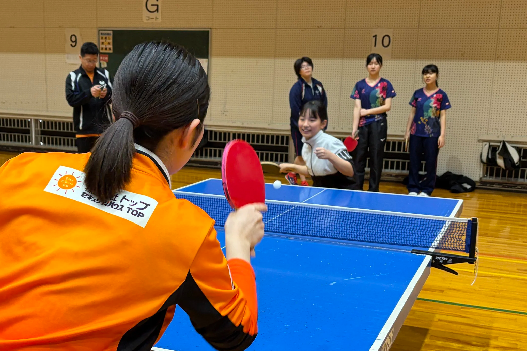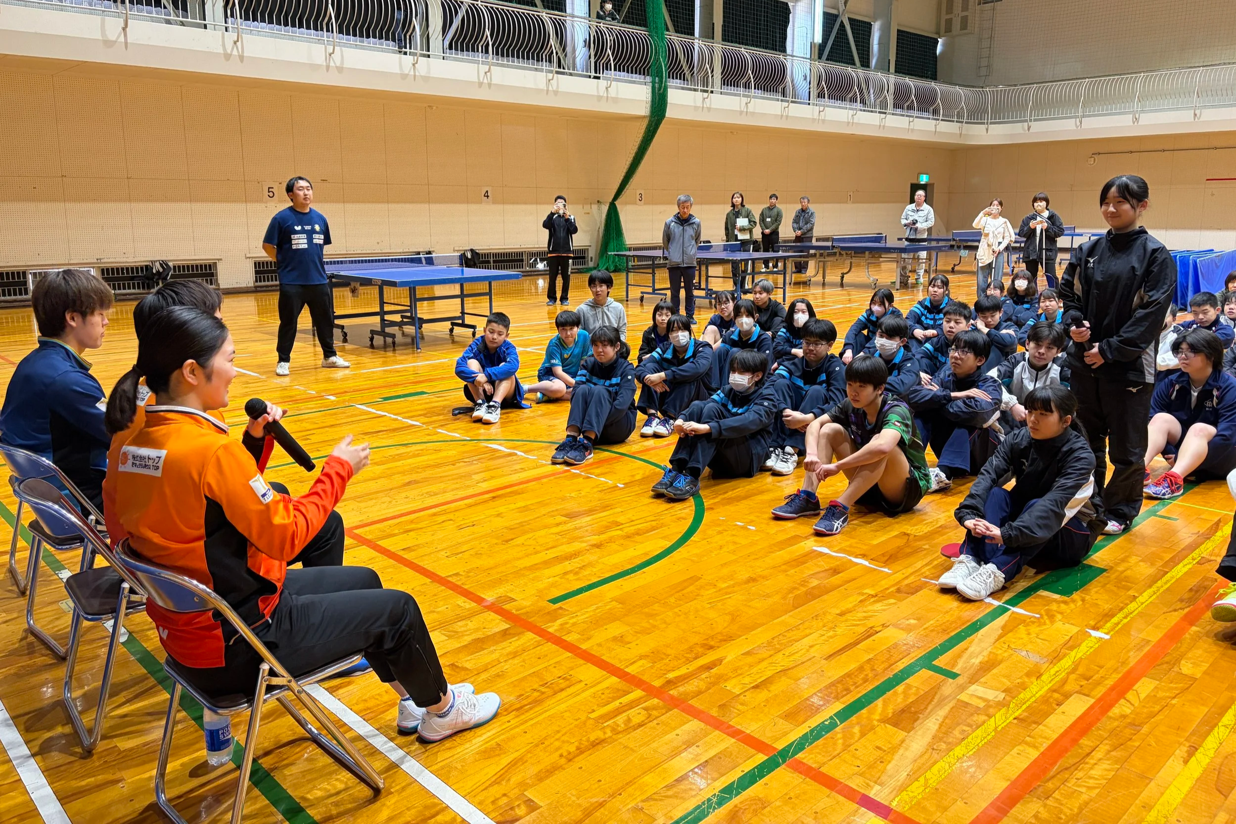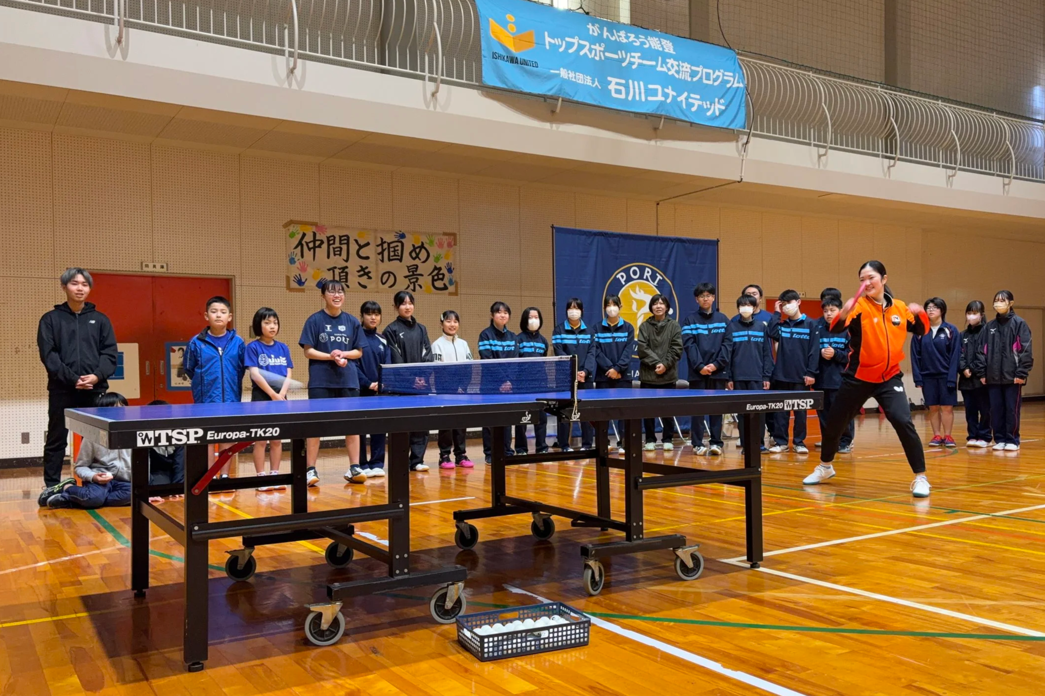 能登で卓球をしている小中高学生約40人を対象にした本講習会は、金沢ポートとトップおとめピンポンズ名古屋が特別協力をして穴水中学校の第2体育館で開催しました。